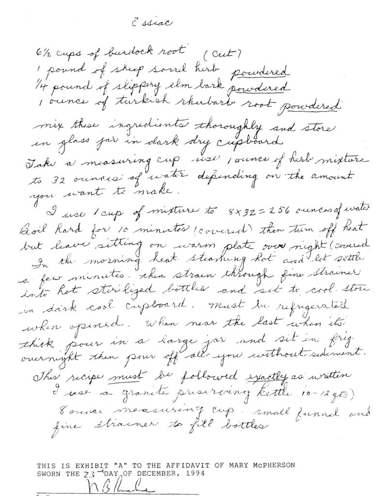 The following formula is Rene Caisse’s Essiac formula and recipe which Mary McPherson, Rene’s best friend, filed under Oath with the Town of Bracebridge, Ontario in 1994.